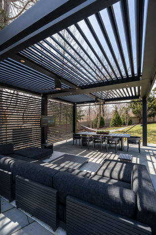 Designed with Struxures’ signature motorized louvered roof, the homeowners can control sunlight and airflow with the push of a button. A privacy slated wall on the back side adds both visual interest and sun protection, while a large sectional and dining table allow for indoor-level hosting—outside.